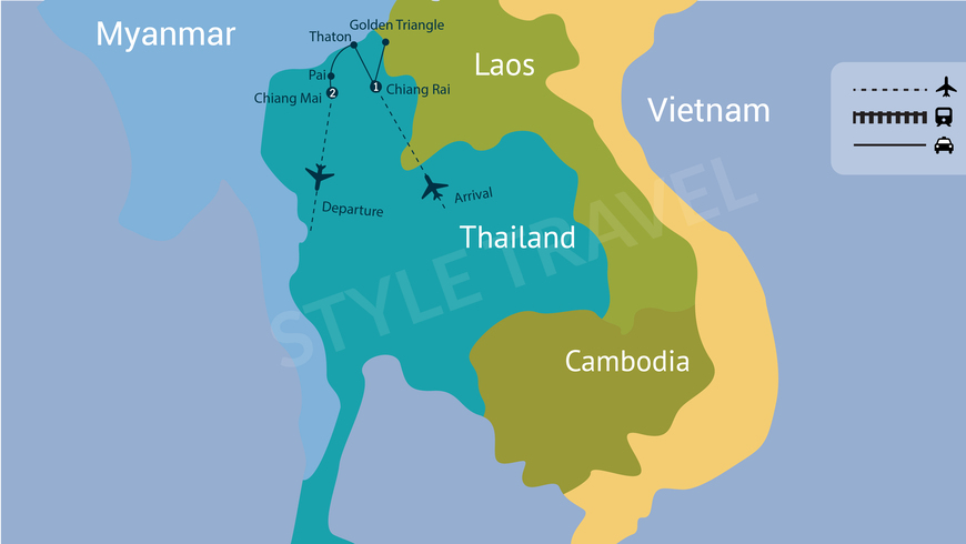 Transfert pour visiter la ville de Chiang Rai - Un endroit boisé, montagneux et magnifique. Après une promenade dans le marché local, vous êtes transféré à Doi Mae Salong. Vous grimpez et dévalez les collines verdoyantes couvertes de plantations de thé avant de visiter le musée de l'opium. Ensuite, vous embarquez sur un bateau à longue queue du côté laotien et voyez du haut de la colline le véritable "Triangle d'Or". Enfin, découvrez les tribus intéressées: Yao et Akha, et les célèbres femmes girafes.