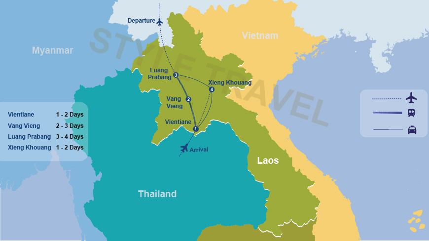 Pour un court voyage avec un circuit de 3 ou 4 jours, vous devriez vous concentrer sur le circuit de Luang Prabang, qui est populaire pour l'histoire et la culture du Laos. Si vous avez plus de temps, vous pouvez d'abord visiter Vientiane pour ressentir la magnifique ville pleine de villas, puis prendre un train express pour Vang Vieng et passer environ 1 ou 2 jours dans cette charmante ville. Ensuite, prenez un autre train express jusqu'à Luang Prabang et faites un tour complet de 6 ou 7 jours au Laos.