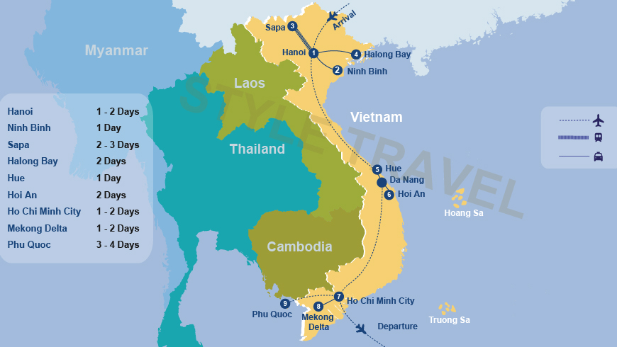 Plan du tour, bref itinéraire et nombre de jours estimé pour un circuit typique en Vietnam