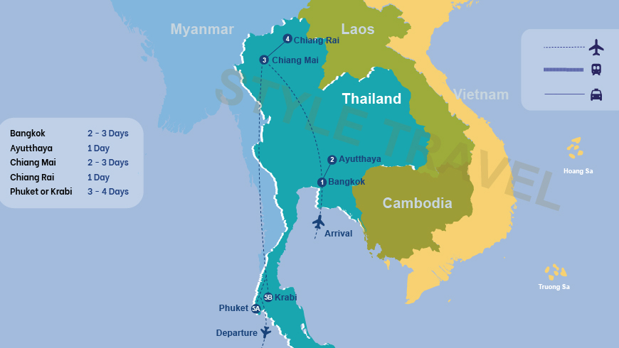 Votre voyage commence à Bangkok, la capitale et la plus grande ville du pays, réputée pour ses sanctuaires richement décorés et sa culture de rue active. Après y avoir passé deux à trois jours, vous prenez un vol pour Chiang Mai ou Chiang Rai, deux villes montagneuses du nord dotées de nombreuses attractions touristiques. Après cela, vous prenez un vol pour l'île de Phuket ou Krabi pour visiter les superbes plages magnifiques aux longs rivages blancs et terminez votre voyage ici.